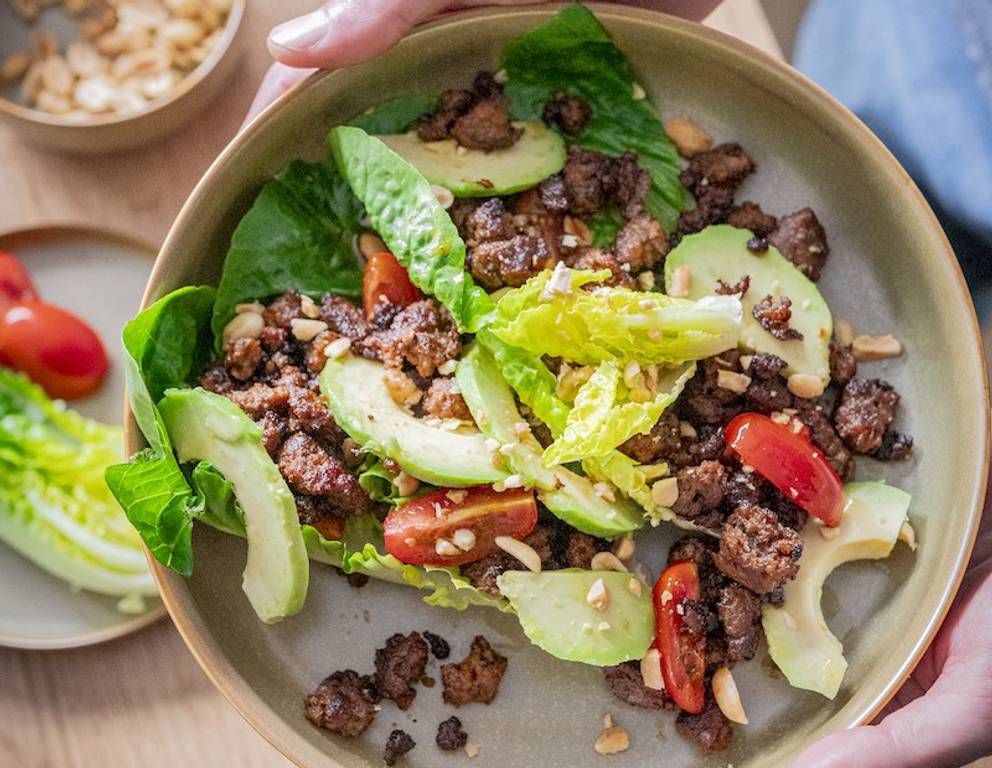 - Die Salatblätter mit dem Hackfleisch und dem Harissa-Sud in vier Schalen schichten, die Tomatenviertel und Avocadoscheiben dazwischensetzen. Mit den gehackten Erdnusskernen bestreut servieren.