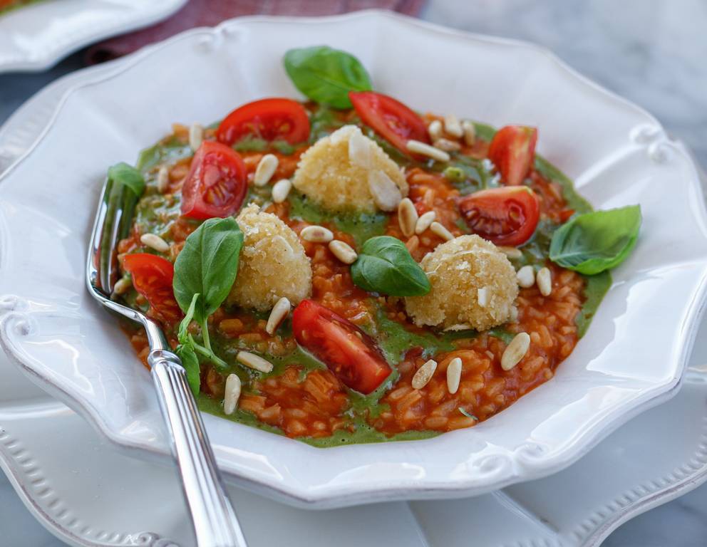 - Tomaten-Risotto auf Teller anrichten und mit je 3-4 gebackenen Mozzarella-Bällchen servieren. Nach Belieben noch mit gerösteten Pinienkernen toppen.