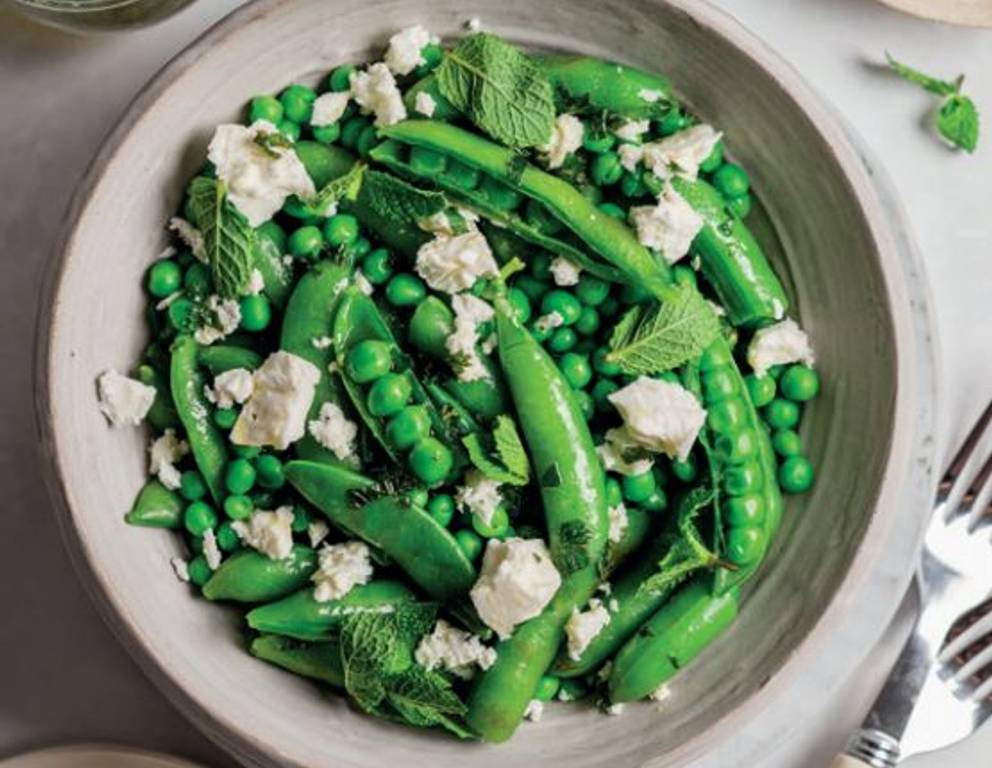 - Ein wenig Wasser salzen und zum Kochen bringen. Zuckererbsenschoten und Frühlings-Erbsen unaufgetaut hineingeben und nach dem Wiederaufwallen des Wassers ca. 3-4 Minuten weiterkochen.  Das Gemüse abgießen, kalt abschrecken und gut abgetropfen, anschließend in eine Salatschüssel geben.