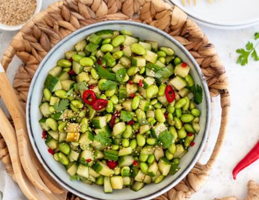 - In einer Schüssel Sojabohnen und Gurkenstückchen vermischen.
