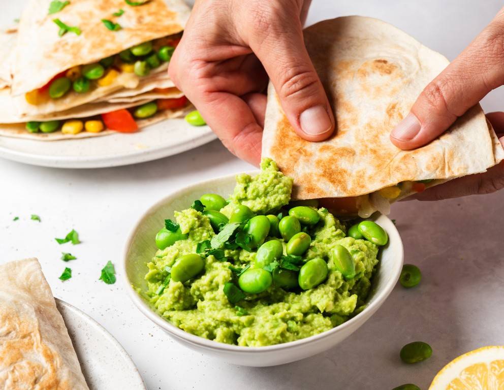Quesadillas mit Gemüsefüllung und Edamame-Guacamole