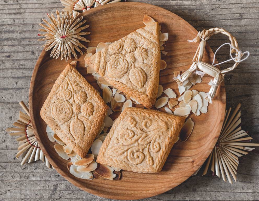 - Das vorbereitete Backblech mit Mandelblättchen bestreuen und die Kekse daraufsetzen. Bei Bedarf mit einem leicht bemehlten Musterstempel das Muster aufdrücken. Im vorgeheizten Backrohr unter Aufsicht 10–13 Minuten hellbraun backen.