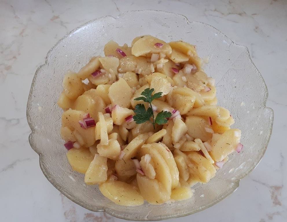 - Den Essig mit der Suppe vermengen und über die Kartoffelscheiben gießen.