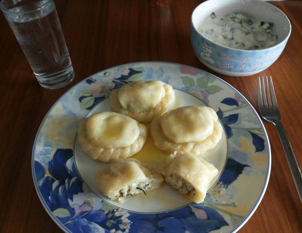 - Fein geschnittene Zwiebeln in Butter anlaufen lassen, die gehackten Kräuter dazugeben, salzen und unter die Topfenmasse mischen. Aus der Masse ca. 18-20 Kugeln formen und diese, wie im Kasnudel-Grundrezept beschrieben, mit Teig umhüllen.
