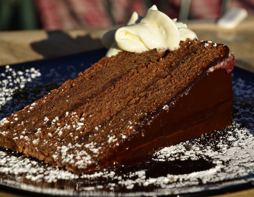 Probieren Sie zur Schokolade-Nuss-Torte einen Tupfer Schlagobers und verwenden Sie ein Minzeblättchen zur Garnitur.