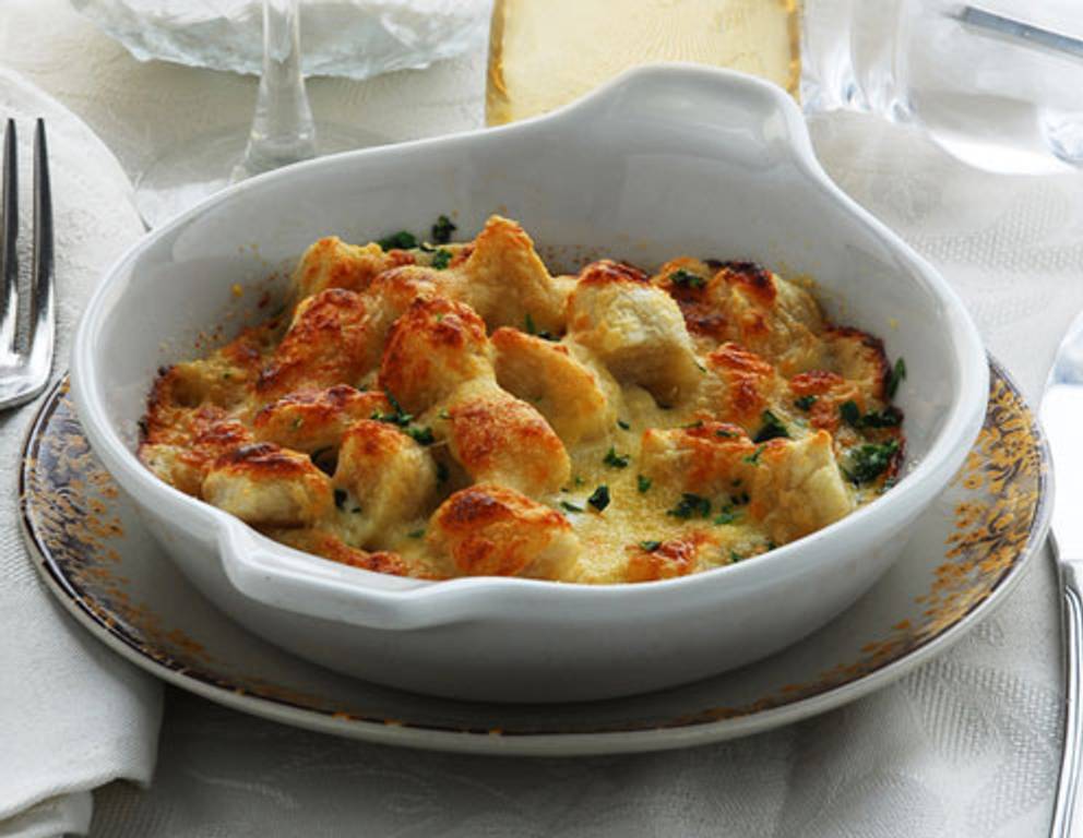 - Die Sauce Mornay darüber gießen und im vorgeheizten Backrohr bei 200 °C 20-25 Minuten backen.