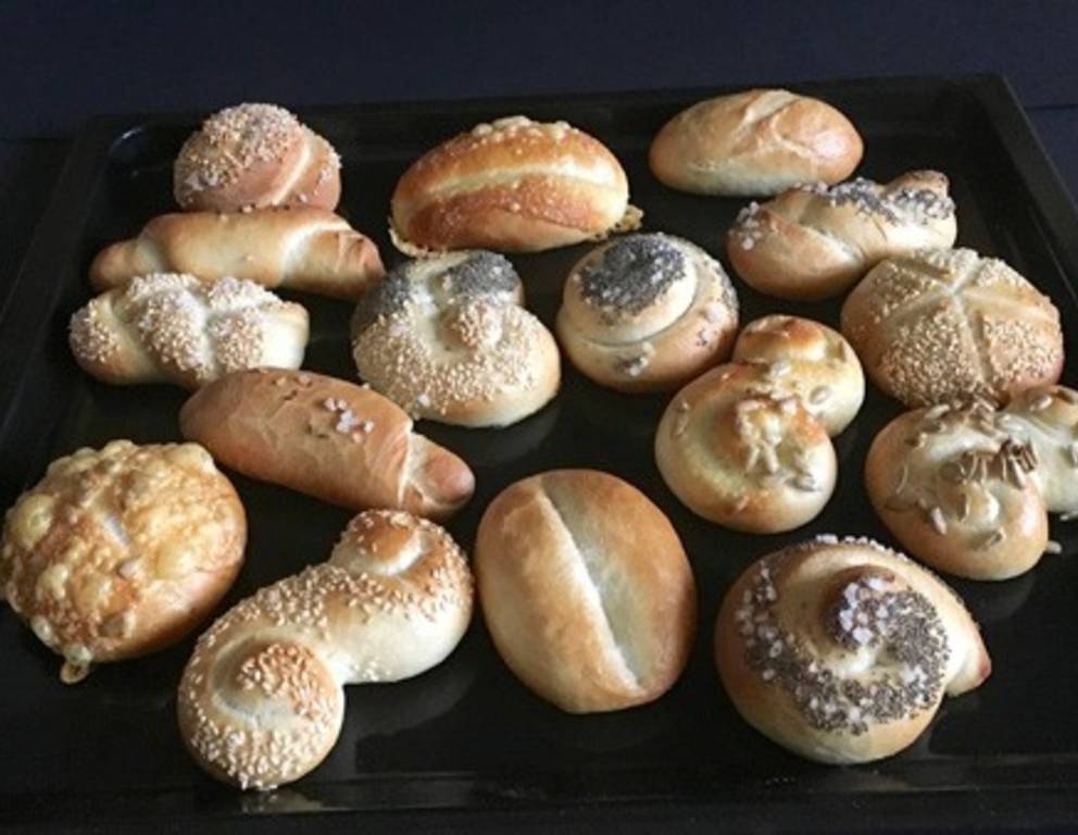 - Zwei Röllchen formen, je in fünf Arbeitsschritte teilen und daraus verschiedene Weckerl formen.