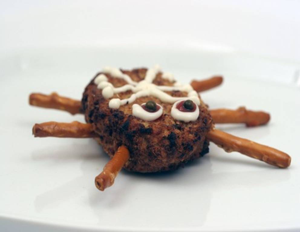 - Für Essbare Spinnen machen Sie kleine Chilli-Fleischlaibchen und bestücken Sie diese ringsum mit acht Salzstangen.
