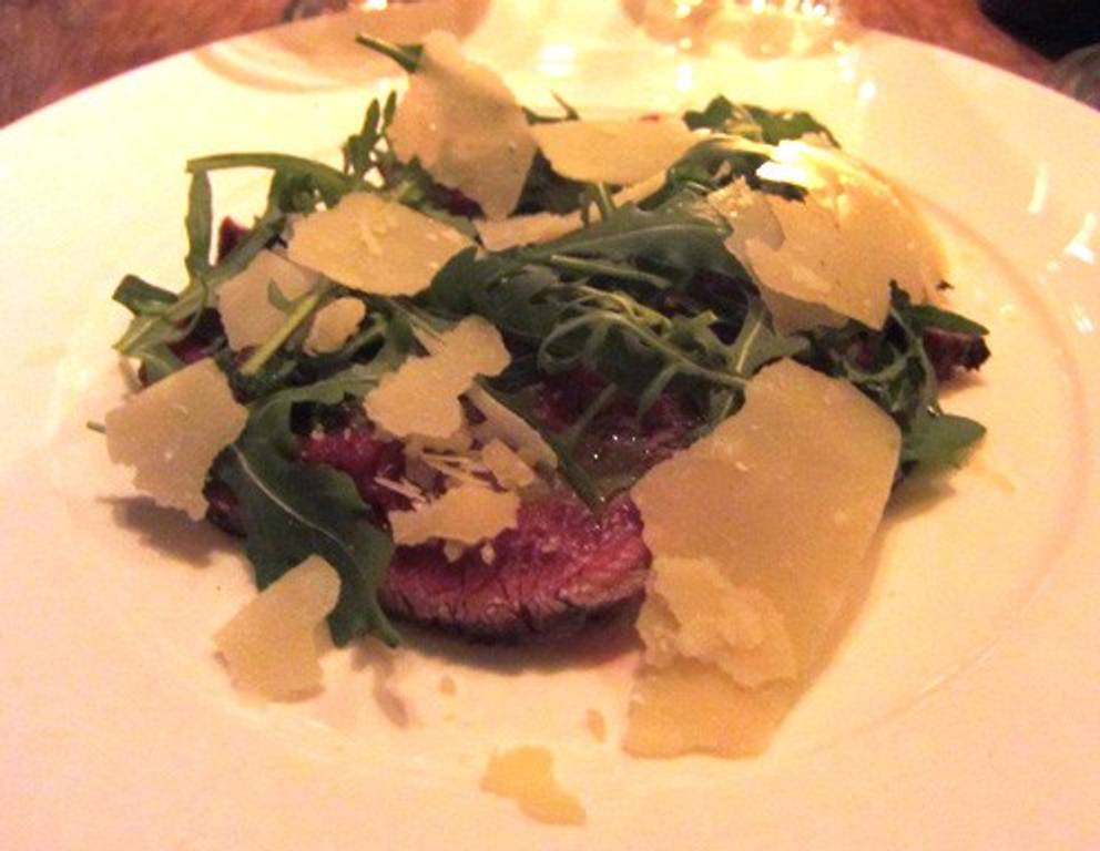 - Die gewaschene, abgetropfte Rucola damit marinieren. Jedes Filet mit grobem Meersalz würzen, in etwa 0,5 cm dicke Scheiben schneiden. Die Rucola auf Tellern anrichten und die Filetstreifen attraktiv darauf platzieren.