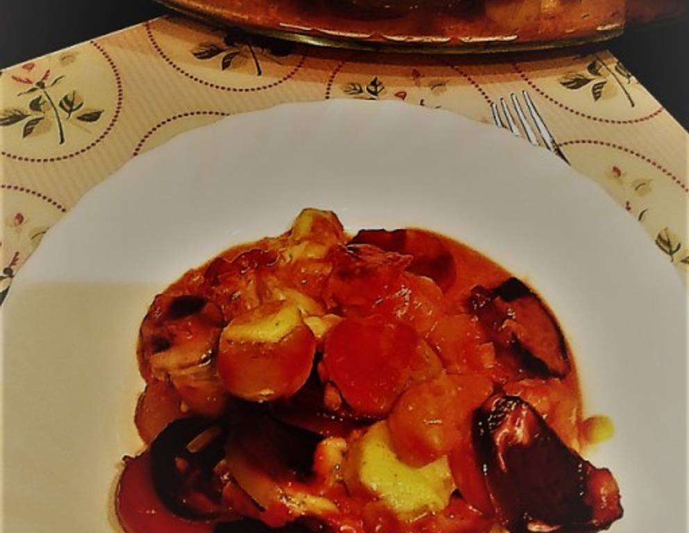 - In eine eingefettete Gratinplatte gibt man lagenweise die gehackten Zwiebeln und die in Stengel bzw. Scheibchen geschnittenen Rote Rüben und Erdäpfeln. Daraufhin wird die Suppe zugegossen und alles zusammen bei geschlossenem Deckel im Herd bei mittlerer Hitze rund 40 min weichgedämpft.