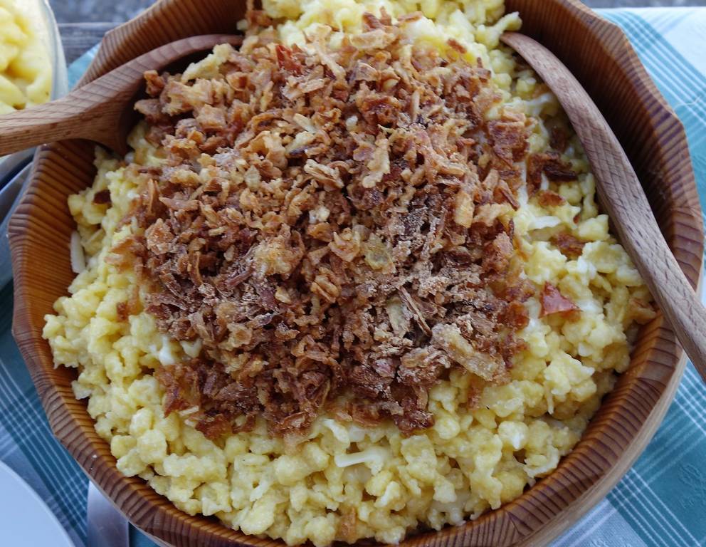 - Währenddessen die restlichen Zwiebeln in Ringe schneiden und in heißem Öl braun rösten. Salzen. Die Kasnockerln anrichten, mit frisch geschnittenem Schnittlauch bestreuen und mit Röstzwiebeln garnieren.