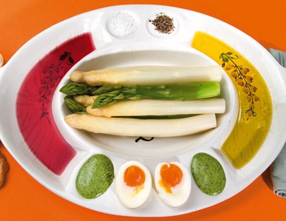 - Den weißen Solospargel vom Kopf weg sorgfältig schälen. Die holzigen Enden des Spargels gleichmäßig wegschneiden. Für den Spargelsud 2,5 Liter Wasser mit Salz, Zucker und Butter aufkochen lassen. Den geschälten Spargel in den heißen Sud legen und je nach Spargeldicke und Qualität ca. 18-25 Minuten knapp unter dem Siedepunkt ziehen lassen. Der Spargel sollte weich, aber noch bissfest sein. Wird der Spargelsud noch weiter verwendet, muss der hohe Zuckeranteil berücksichtigt werden. Vom grünen Spargel das holzige Ende abschneiden und eventuell das letzte Drittel schälen. Nun in Salzwasser je nach Dicke des Spargels 5-10 Minuten kochen. Für die Kräutersauce Petersilie, Basilikum, Parmesan, Senf sowie 4 Esslöffel Wasser mixen. Nach und nach so viel Olivenöl einfließen lassen, dass eine homogene Sauce entsteht. Mit Salz und Pfeffer abschmecken. Für die pochierten Eier ungesalzenes Essigwasser aufkochen lassen. Die Eier einzeln in einen Schöpfer schlagen und von diesem in sprudelndes Salzwasser gleiten lassen. Etwa 4 Minuten kochen und dann wieder herausheben. Nun den Spargelteller anrichten. Verfügt man nicht über den typischen Spargelteller aus Tavagnacco mit seinen zahlreichen Vertiefungen, den Spargel (grün und weiß) in die Mitte eines Tellers platzieren. Olivenöl, Weinessig, Meersalz, geschroteten Pfeffer, Kräutersauce sowie die pochierten Eier rundum - am besten in kleinen Schüsselchen oder Kännchen - anrichten.