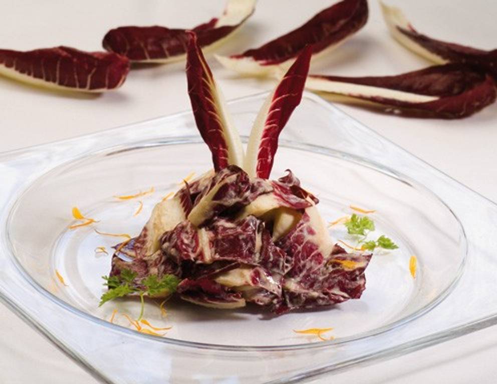 - Radicchio mit dem Dressing marinieren und den Trevisaner Radicchiosalat auftragen.