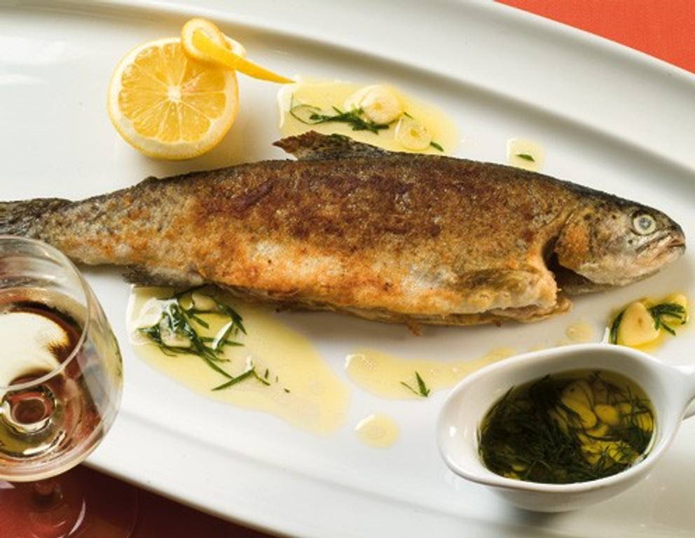 - Die küchenfertigen Forellen salzen, pfeffern und mit Zitronensaft beträufeln. In Mehl tauchen, überschüssiges Mehl abklopfen und die Fische in heißem Öl beidseitig ca. 12 Minuten braten. Die Forellen herausheben und warm stellen. Den Bratrückstand abgießen, den gehackten Knoblauch in der Pfanne kurz durchrühren und Butter sowie Rindsuppe zugeben. Einmal aufkochen lassen. Die gehackte Petersilie beigeben und mit Salz abschmecken. Die Forellen anrichten, mit etwas Sauce beträufeln und die restliche Sauce in einem Kännchen extra dazu servieren.