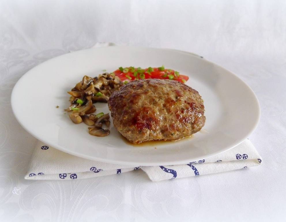 - Fleischlaibchen mit den Champignons sowie den Tomatenscheiben anrichten, mit Petersilie garnieren und servieren.