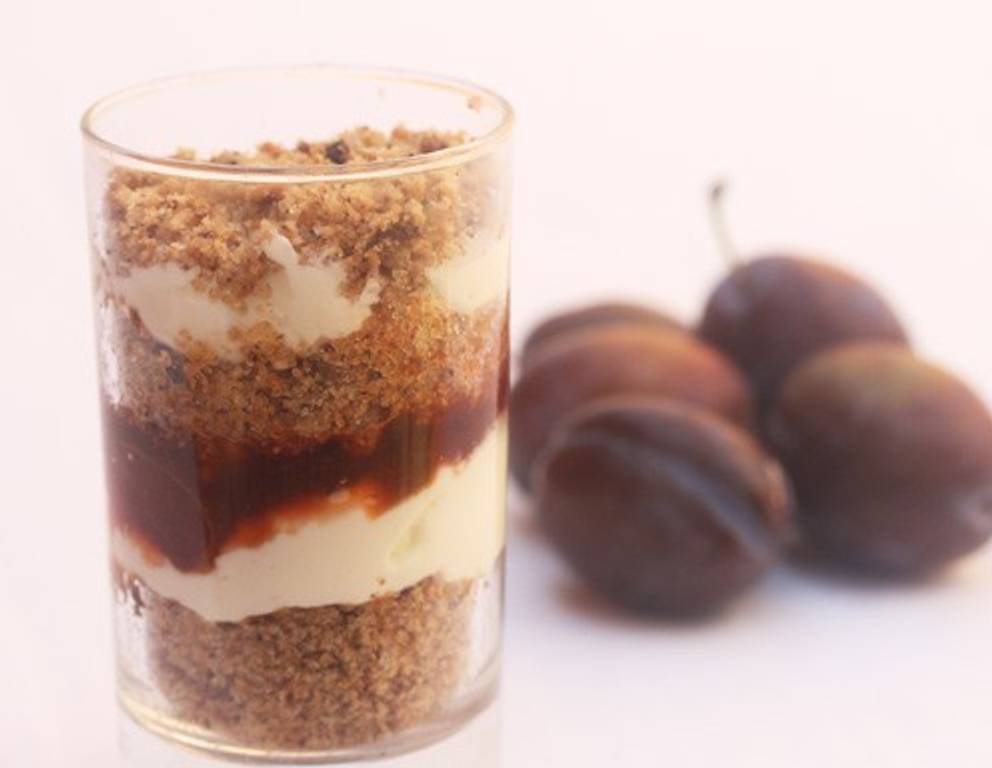 Zum Anrichten nehmen Sie kleine Gläser (ca. 1/8l) und schichten Sie abwechselnd Brösel, Creme und Zwetschken übereinander. Mit den Bröseln abschließen und überzuckern.