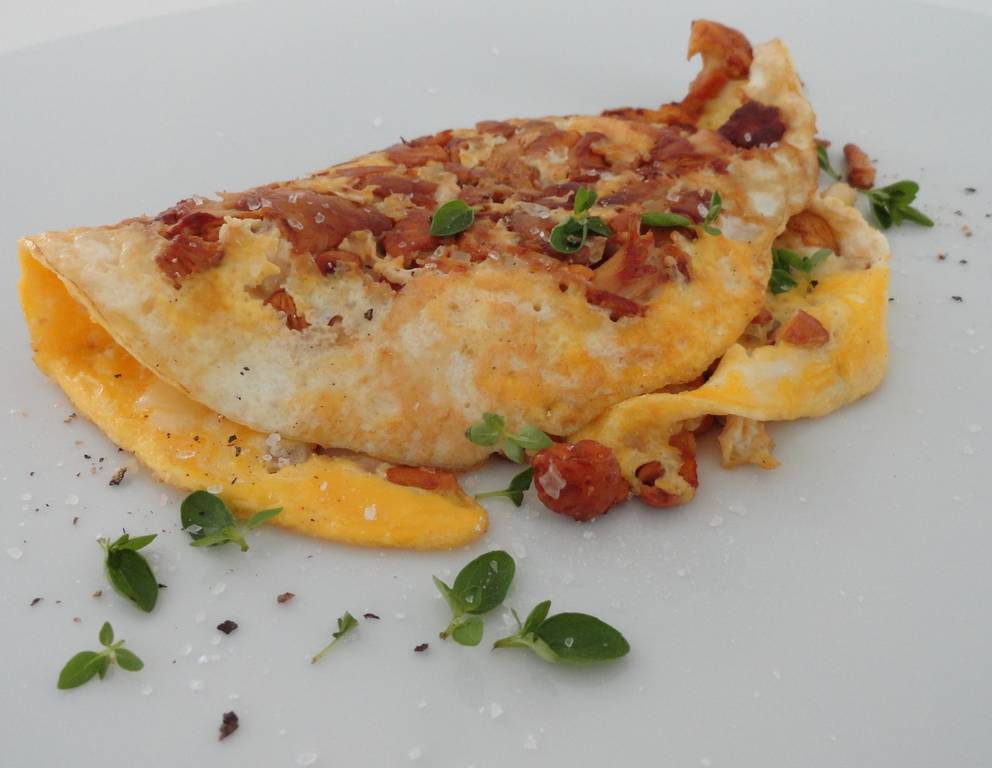 Das Omelett mit Eierschwammerln anstatt mit Schinken, mit würzigem Speck zubereiten.