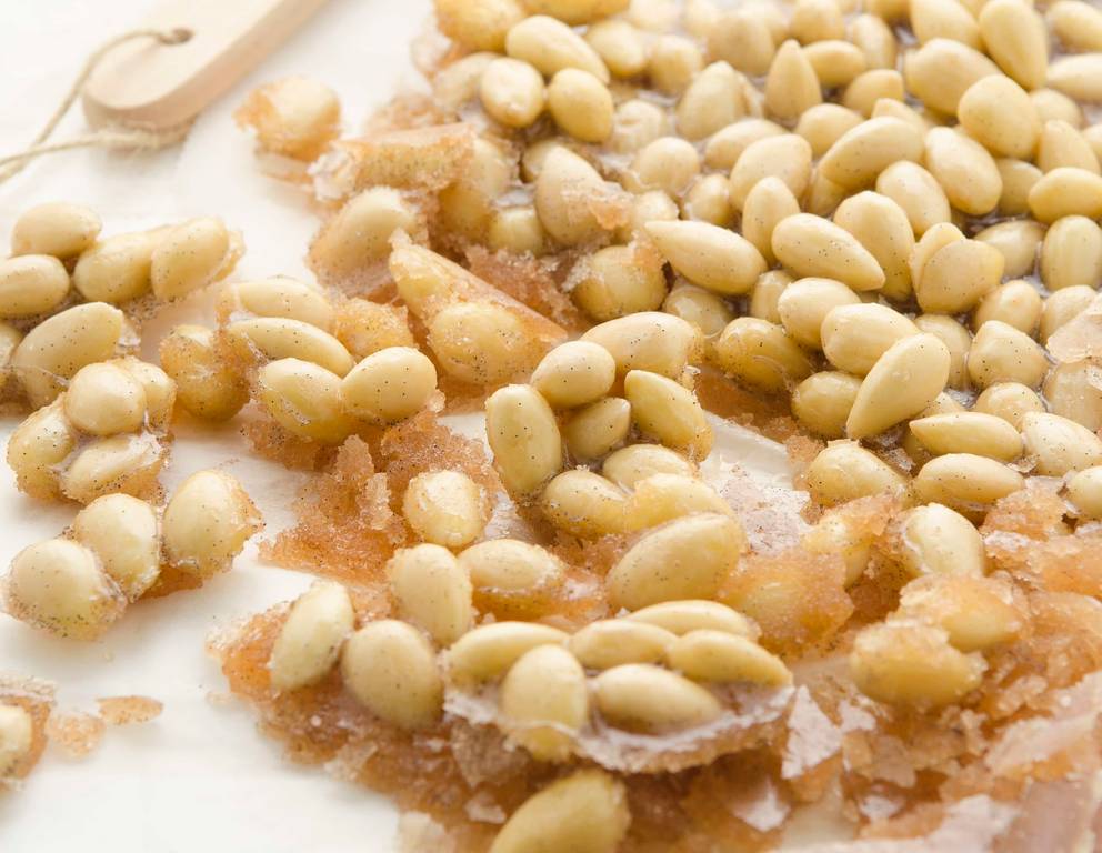 Karamellisierte Vanille-Mandeln als Garnitur für Dessert oder zu Eiscreme servieren.