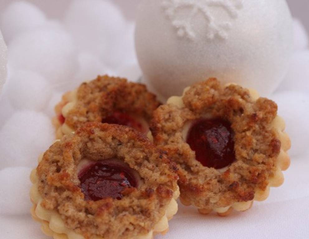 - Nach dem Auskühlen jeweils einen gelochten und einen ungelochten Keks mit Ribiselmarmelade zusammenkleben.