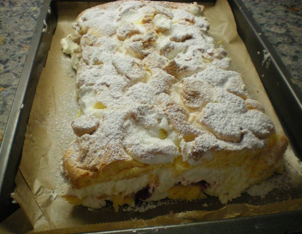 - Die fertig gebackene Masse in zwei gleich breite Streifen schneiden, die Streifchen mit Creme bestreichen und zusammensetzen, gut abkühlen lassen, zuckern und in Schnitten teilen. Die Kardinalschnitte servieren.