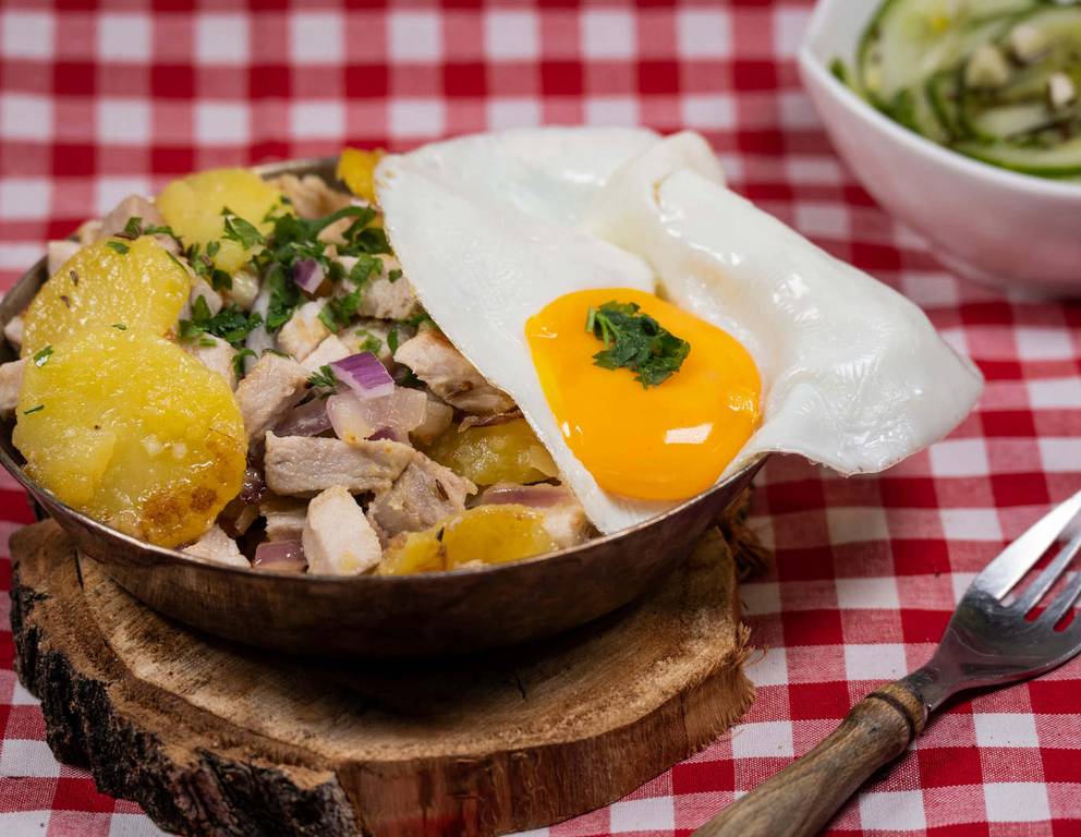 Hat man Bratenreste zur Verfügung, so erübrigt sich das Dünsten des Fleisches. In diesem Fall röstet man die gekochten Kartoffeln gleich mit dem bereits gegarten Fleisch und den Zwiebeln knusprig.