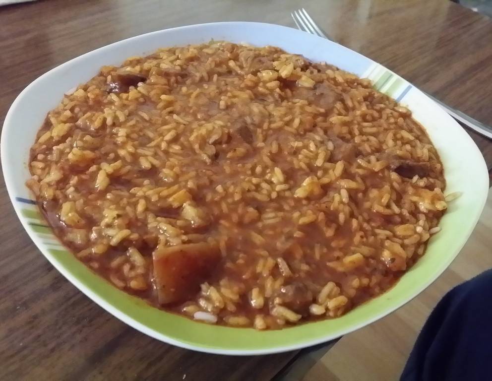 Besonders dekorativ sieht das Reisfleisch aus, wenn man es vor dem Servieren auf einer vorgewärmten Platte anrichtet und mit einer leichten Paprikasoße umgießt.