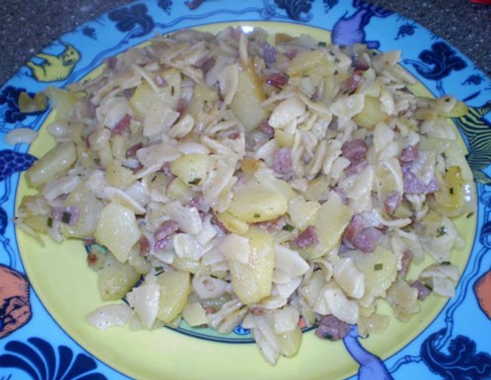 - Dann zunächst die Erdäpfelscheiben hinzufügen und beidseitig goldbraun rösten. Erst am Schluss die Teigwaren unterheben und alles mit Salz, Pfeffer, Majoran und eventuell auch etwas Paprika würzen. Mit Petersilie bestreut servieren.