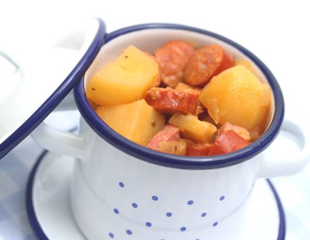 Anstatt mit Würsten lässt sich das Erdäpfelgulasch auch äußerst wohlschmeckend mit würfelig geschnittenem Geselchten zubereiten.