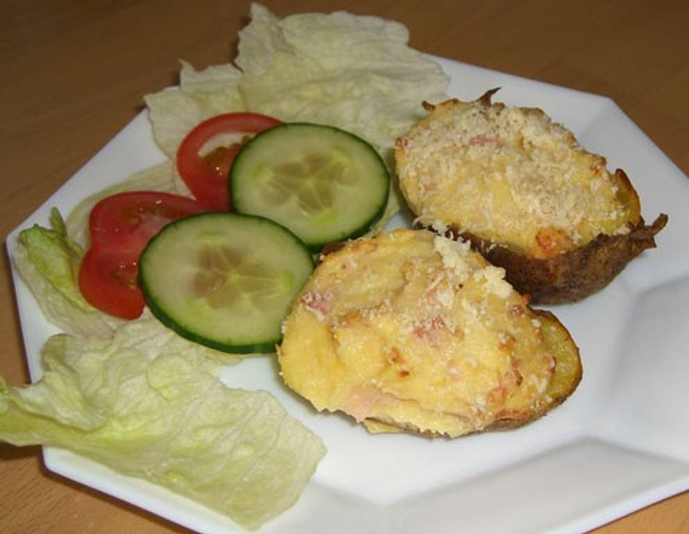 - Den Backofen auf 200° vorheizen. Die Kartoffeln vollständig einölen und auf einem mit Backpapier ausgelegten Blech ca. 1 Std. backen, bis sie weich sind. Die Kartoffeln herausnehmen, längs halbieren, mit einem Löffel vorsichtig aushöhlen und das innere in eine Schüssel geben. Die Schalen beiseite stellen. Milch, Butter, Butterkäse und Eigelb zu den Kartoffeln geben und alles gemeinsam mit dem Mixer verrühren. Nach Geschmack salzen und Pfeffern. Dann den Schinken einrühren. Das Eiklar zu festen Schnee schlagen und unter die Kartoffelmasse heben. Die Kartoffelfüllung in die Kartoffelschalen füllen und mit Butterkäse bestreuen. Wieder in den Ofen stellen und weitere 20 Minuten backen.