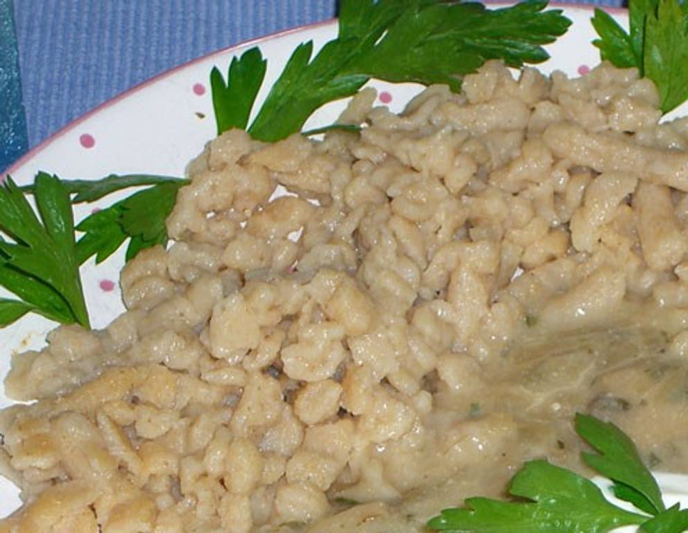 - Das Mehl, Salz, geriebene Muskatnuss und das Wasser mit dem Mixer ca. 5 Minuten gut verrühren. Danach mind. 10 Minuten quellen lassen. Einen Topf mit Wasser und etwas Salz hinstellen und zum Kochen bringen. Mit einem Spätzlehobel den Teig in das Wasser schaben.