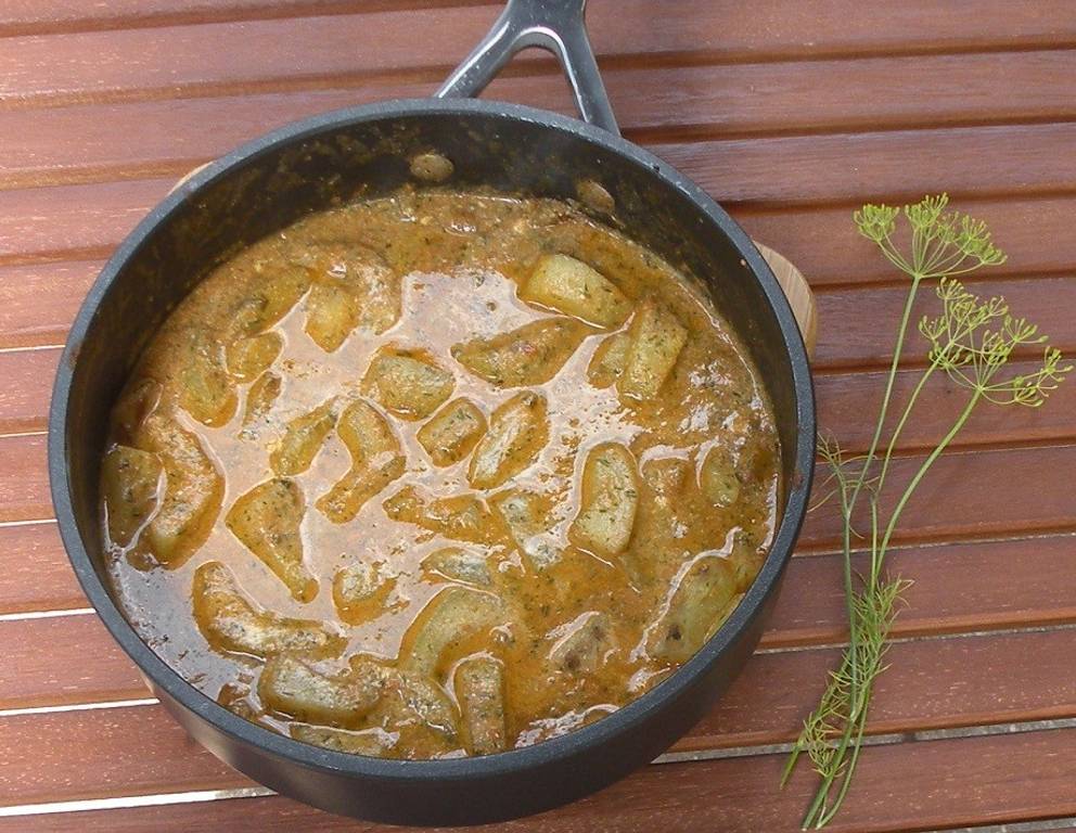 - Die Gurken abgetropft dazugeben, gut durchrühren und bei mittlerer Hitze sechs bis acht Min. gardünsten. Den Sauerrahm bzw. Crème fraiche und Wasser zugiessen, gut durchrühren, von Neuem zum Kochen bringen, nachwürzen und vielleicht nachsalzen.