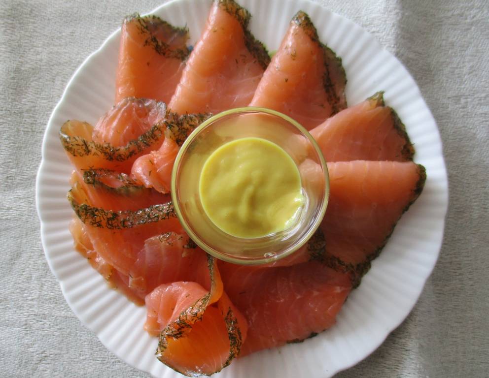 - Den Lachs nun in diagonal hauchfeine Scheiben schneiden. Auf einem Teller oder evtl. einer Platte anrichten, mit der Sauce und evt. Weißbrot servieren.