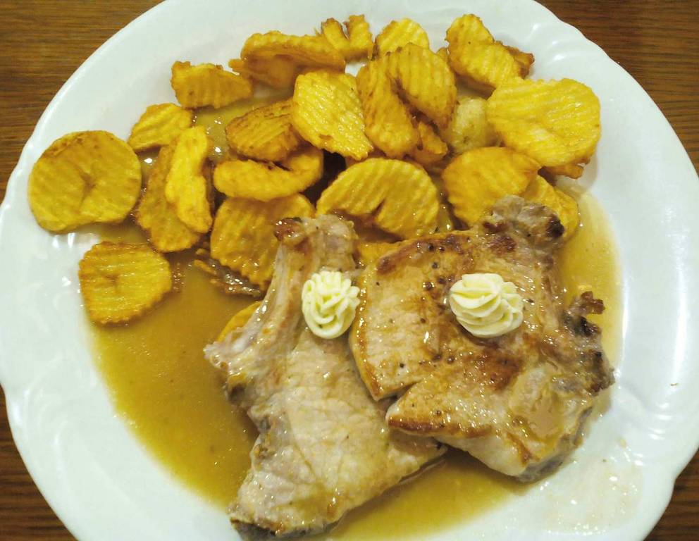 Zu den Schweinskoteletts in Kümmel-Bier-Sauce passt als Beilage Bratkartoffeln oder andere Beilagen nach Geschmack.