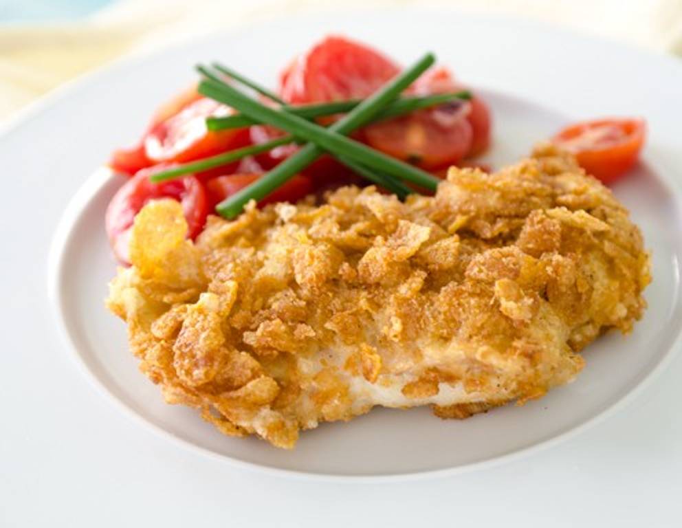 Zur Scholle in Cornflakes-Panade passt Tomatensalat oder auch Kartoffeelsalat.