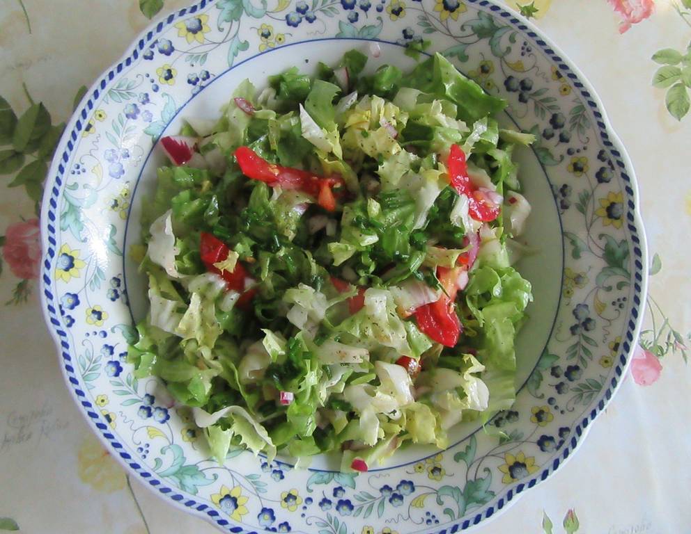 - Paradeiser achteln und auf Teller anrichten. Endivie in Streifchen schneiden. Aus den restlichen Ingredienzien Dressing machen und die Endivie damit einmarinieren. Nach 10 min zu den Paradeiser Form. Mit Schnittlauch garnieren.