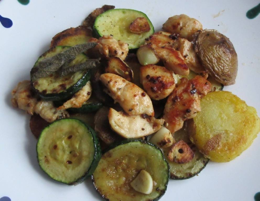 - Erdäpfeln bürsten. Zucchini abbrausen und den Blütenansatz klein schneiden. Erdäpfeln und Zucchini in schmale Scheibchen schneiden. Öl und Butter in einer Bratpfanne erhitzen. Erdäpfeln unter Wenden ungefähr fünf min anbraten. Zucchini hinzufügen und zehn min weiterbraten. Knoblauch abziehen und in Scheibchen schneiden. Salbei abbrausen und abtrocknen. Putenbrust in Stückchen schneiden. Zusammen mit Salbei und Knoblauch zu den Erdäpfeln Form. Drei min weiterbraten.