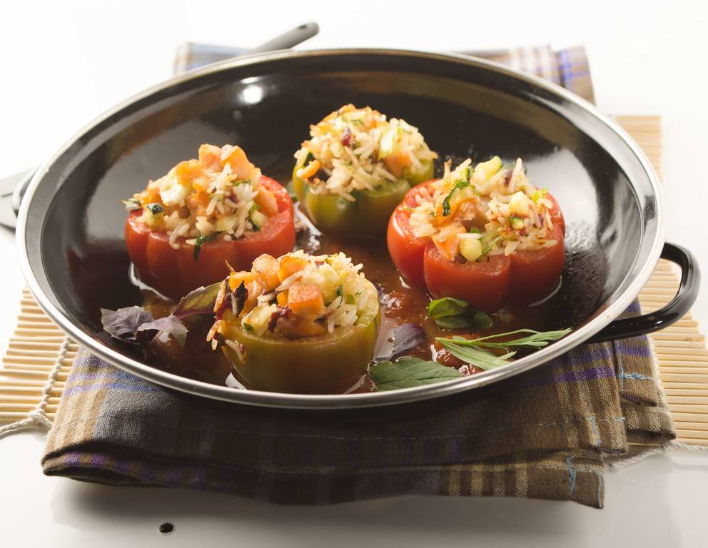 - Basmati-Langkornreis machen. Wenn der Langkornreis gar ist, Gemüse, Pinienkerne und den Knoblauch in einer Bratpfanne andünsten, den Lachs hinzfügen. Alles vorsichtig mischen und mit Pfeffer und Salz sowie Cayenne-Pfeffer herzhaft würzen. Jetzt in die ausgehöhlten Tomaten einfüllen.