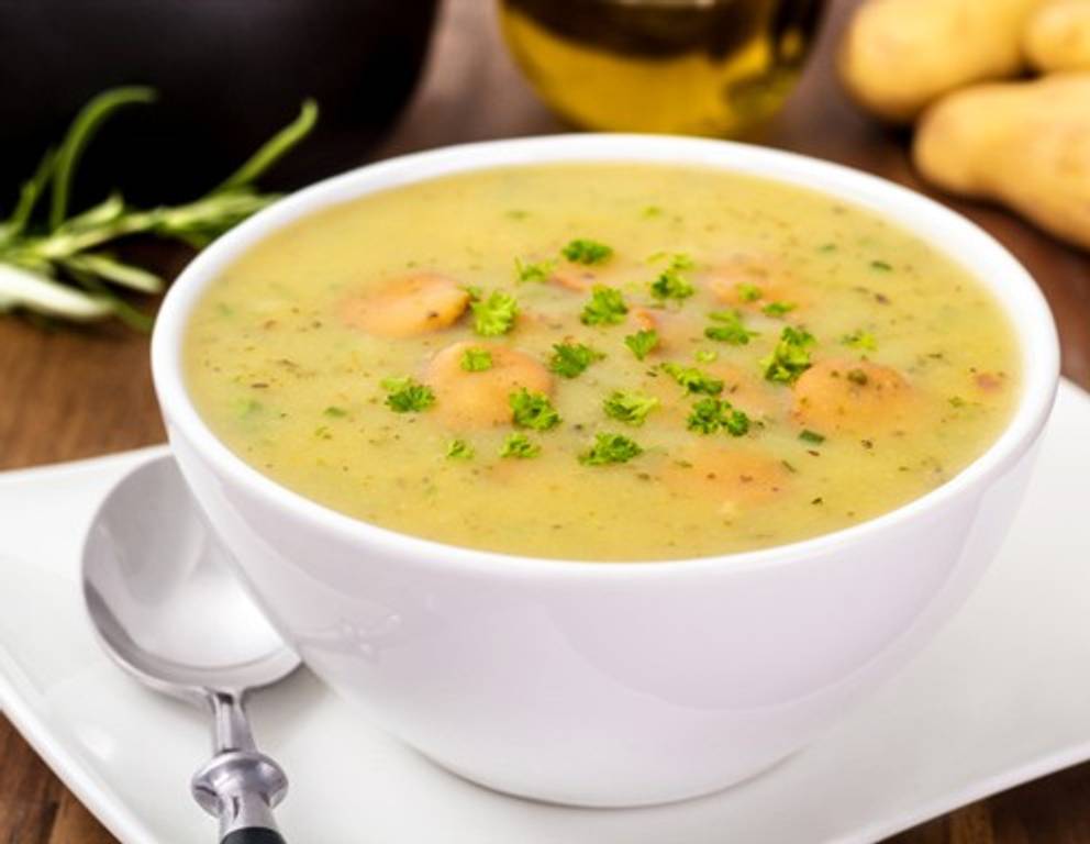 - Lorbeerblatt entfernen und die Kartoffelsuppe mit dem Mixstab fein pürieren.