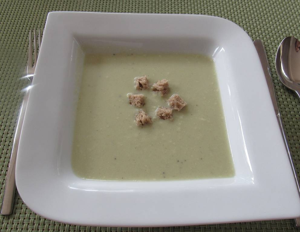 - Weissbrot in Würfel schneiden und in restlicher Butter mit zerdrücktem Knoblauch goldgelb rösten. Suppe mit Brokkoli-Rosen und Brotwürfeln zu Tisch bringen.