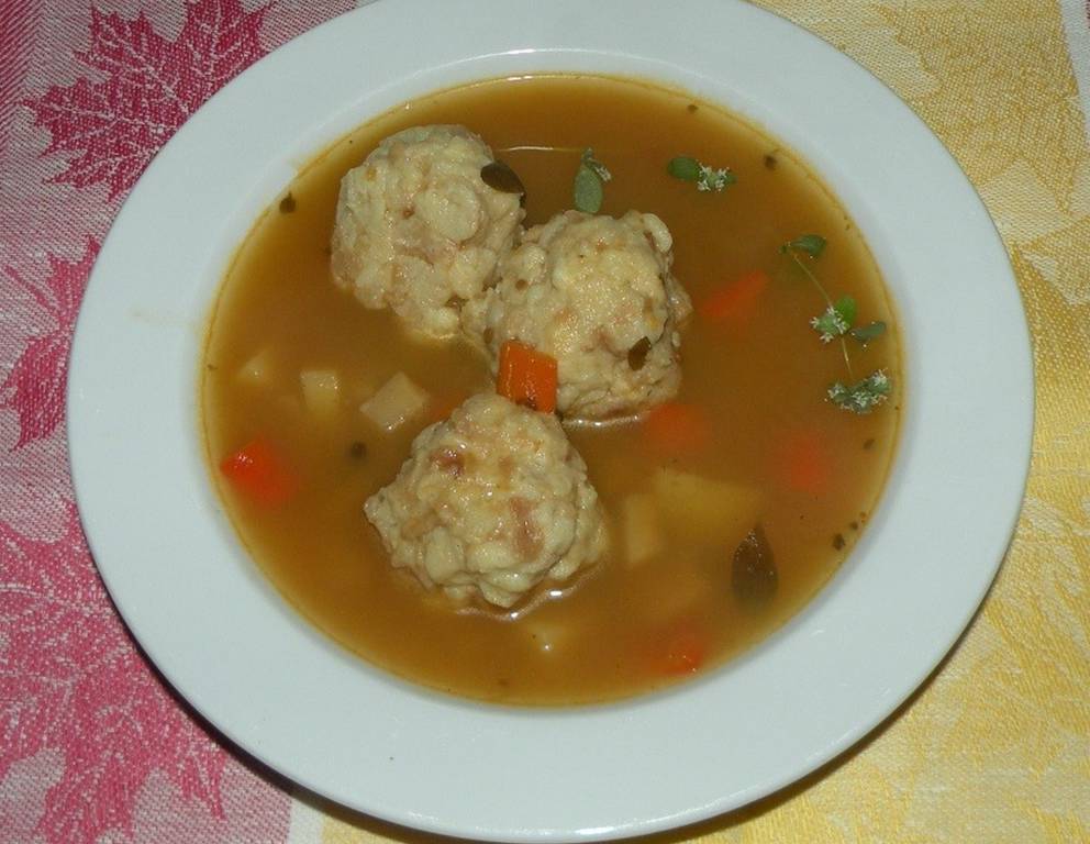 - Die Menge 15 Minuten ziehen lassen, 6 Knödel formen und im Salzwasser bei halbgeschlossenem Deckel 15-20 Minuten einkochen.