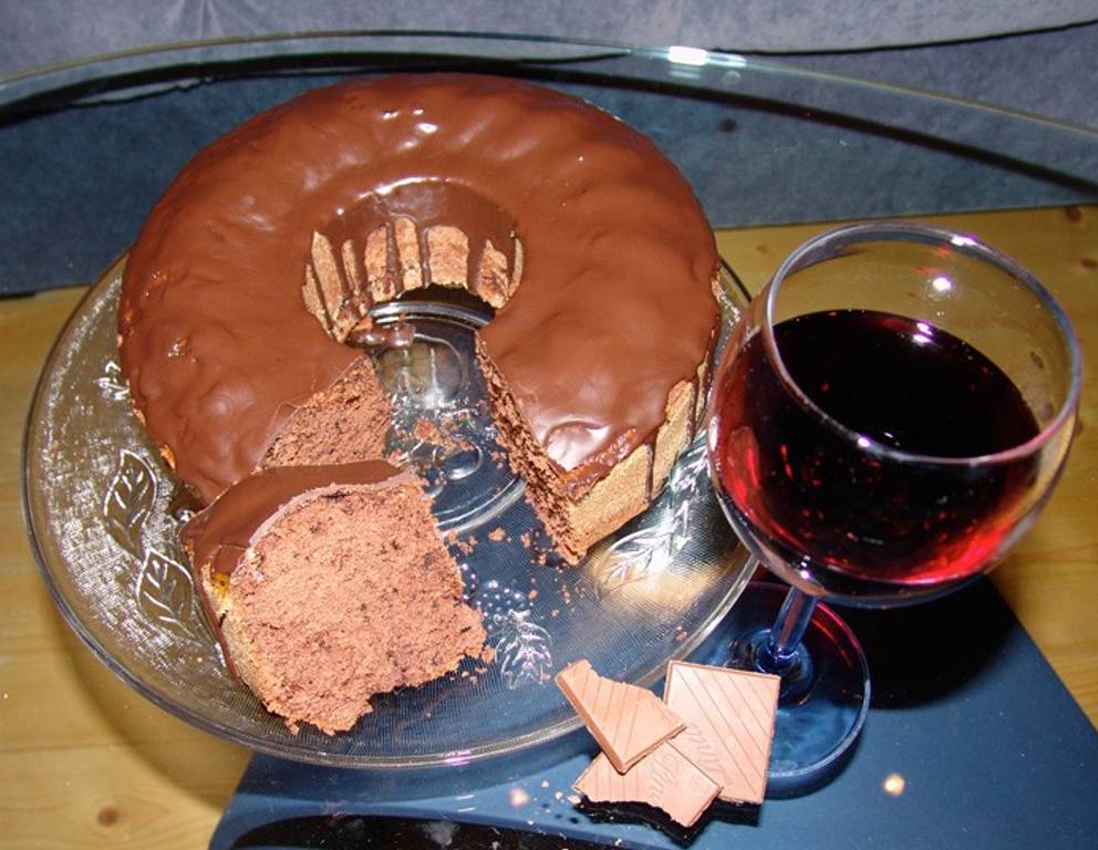- Rotwein und Couvertüre unterziehen. In eine gut eingefettete Kuchen- oder Gugelhupfform füllen und bei 160 °C im aufgeheizten Backrohr in etwa 35 Minuten backen.