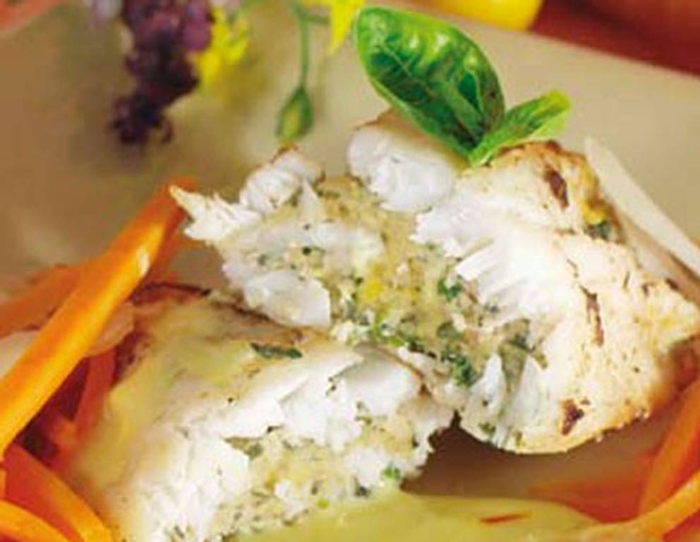 Serviervorschlag: Fischfilets auf Tellern mit Buttergemüse und Safransauce anrichten.