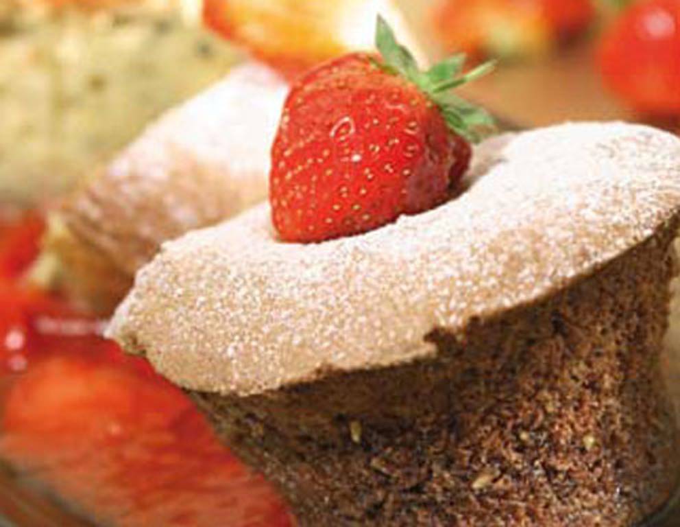 Serviervorschlag: Fruchtspiegel auf Dessertteller setzen und daneben das Soufflé stürzen, mit Staubzucker bestreuen.
