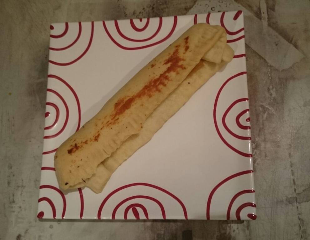 - Teig kneten, dünn ausrollen und längliche Teile schneiden. Käse in die Mitte der Teile verstreuen (Man kann natürlich mit Gouda, Mozzarella, Tomatenmark, Schinken usw. variieren). Die länglichen Seiten ober dem Käse verschließen. Mit ein wenig Mehl bestreuen und bei vorgeheiztem Backrohr bei 250 °C ca. 10 Minuten backen.