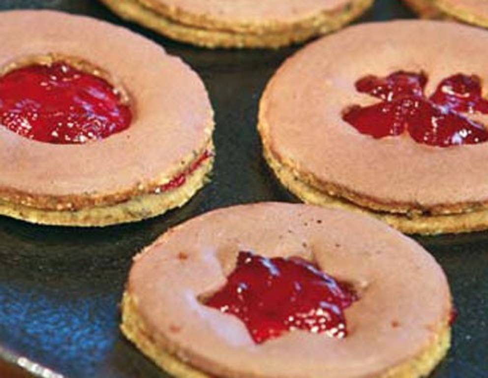 - Für den Teig: Aus den Zutaten einen Mürbteig herstellen und 30 Minuten rasten lassen. Danach den Teig auf einer mit Mehl bestaubten Arbeitsfläche und einem Nudelwalker sehr dünn ausrollen. Mit einer runden Keksform (4cmØ) Kekse ohne Loch und dieselbe Anzahl mit Loch ausstechen. Im Backrohr bei 170°C leicht braun backen und auskühlen lassen.