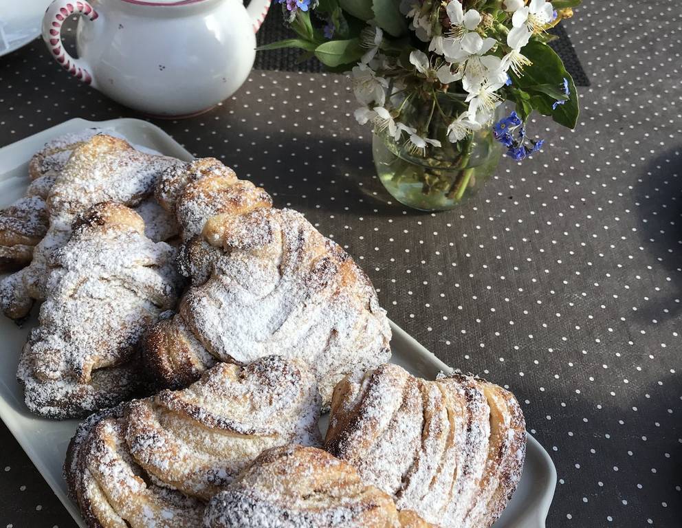 - Die Folie von der Teigrolle entfernen. Teigrolle in 10 Scheiben schneiden. Jede Scheibe zur Mitte hin mit den Fingern zu einer Teigtasche (wie ein Sackerl) formen, sodass 1 EL Füllung hineinpasst. Später jede Teigtasche mit 1 EL Vanille-Zimt-Creme befüllen und die Öffnung mit den Fingern fest zusammendrücken.