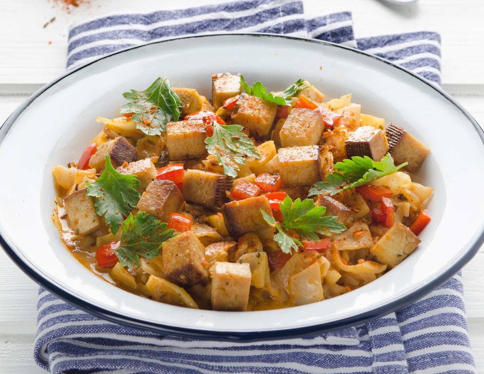 - Paprikakraut in tiefe Teller füllen, Tofuwürfel darüber verteilen, mit Petersilie garnieren und servieren.