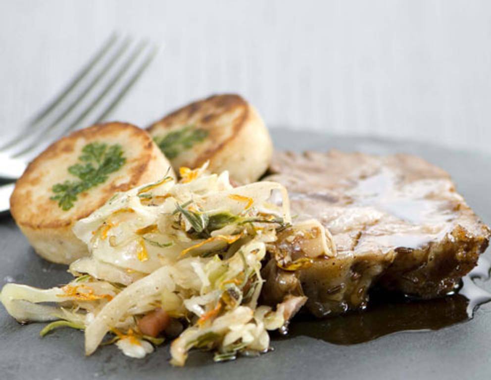 - Die Schopfbratenscheiben mit Salz, Pfeffer, etwas Muskatnuss, zerdrücktem