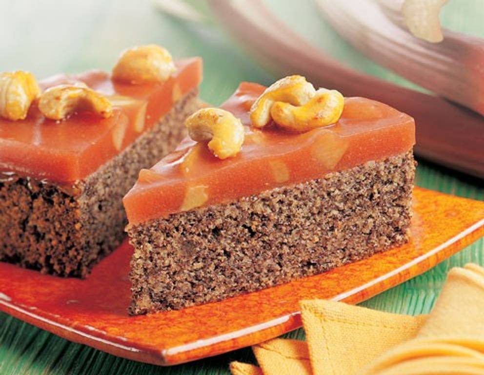 - Für die Garnitur Kristallzucker langsam schmelzen, Cashew-Nüsse und Kronenöl Spezial mit feinem Buttergeschmack beigeben, durchschwenken, auf ein Backpapier legen und abkühlen lassen, anschließend auf die Mohn-Rhabarbertorte mit Cashew Nüssen legen.