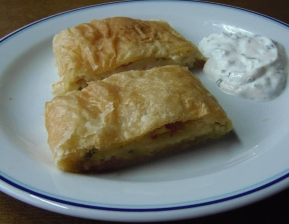 Servieren Sie zum Schinken-Käse-Strudel Kräuter- oder Knoblauchsauce als Beilage.